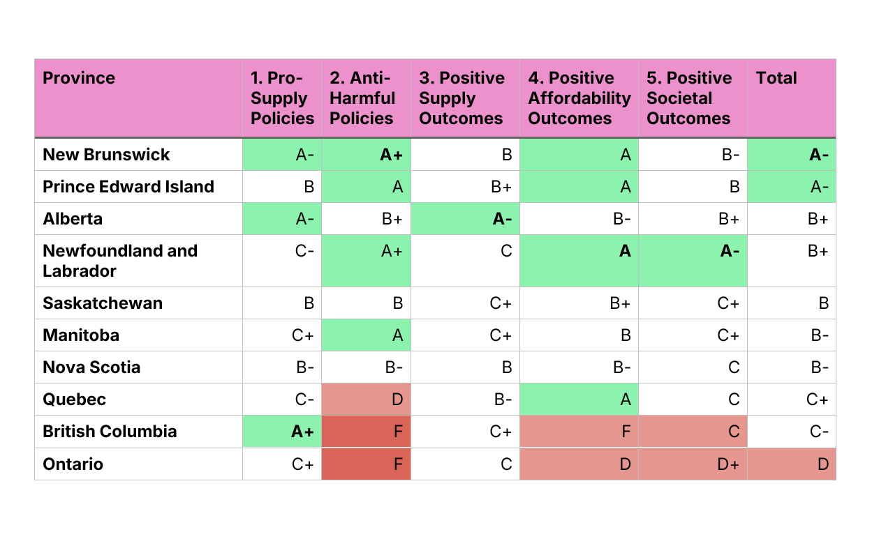 Our goal is to make this report card an annual tradition. For 2025, New Brunswick received the highest overall grade, an 81 (A-), with Prince Edward Island also receiving an A-. Four different provinces led categories: B.C. finished first for pro-supply policies, New Brunswick ranked highest for avoiding harmful and irrelevant policies, Alberta led in positive supply outcomes, and Newfoundland and Labrador topped the charts for positive affordability outcomes and positive societal outcomes related to housing.