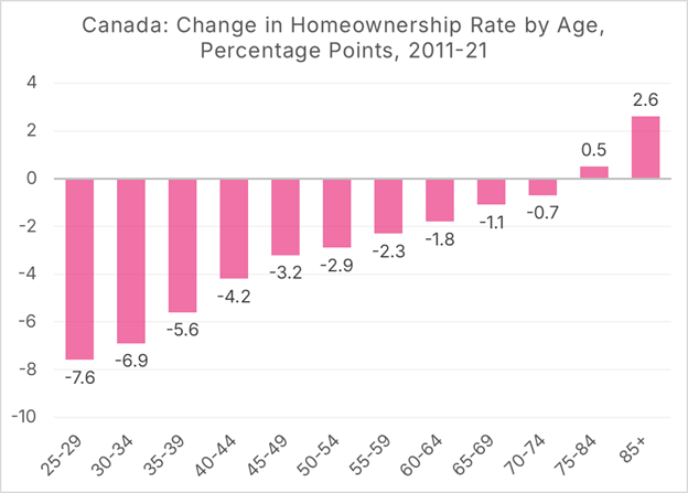 Homeownership is in substantial decline for young Canadians: Between 2011 and 2021, homeownership among 30–34-year-olds fell from 60% to 52%, and the decline is steepest in younger cohorts.