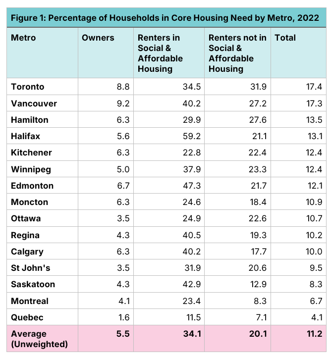 From time to time, Canada measures core housing need. In September 2024, the CMHC released results from the 2022 Canadian Housing Survey, including estimates of core housing need for 15 municipalities across Canada. It found that the GTA and Vancouver CMA had, by far, the highest rate of core housing need in Canada, at 17.4% and 17.3% respectively.
