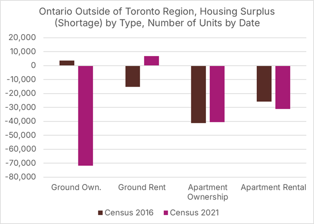 Figure 14. Ontario outside of the Toronto Region housing surplus (+)/shortage (-) by number of units and type, RoCA 3.0 benchmark method, Census 2016 and 2021 data