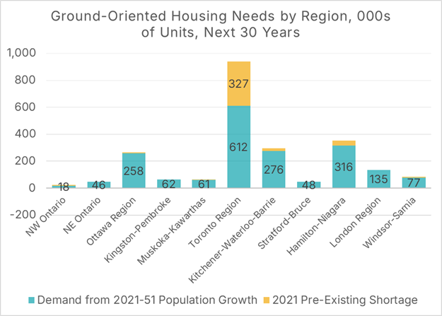 Not surprisingly, the Toronto Region has the highest projected 30-year need for ground-oriented homes, as it has the largest population of any of the regions, and also has the largest pre-existing shortage.