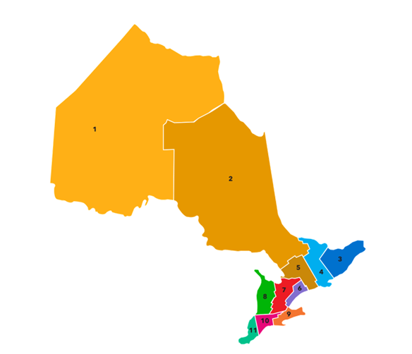 We adopt Statistics Canada’s “economic region” classification, which divides Ontario into 11 different economic regions. We use Regions 3, 4, and 5, as shown below, in our conception of Eastern Ontario.