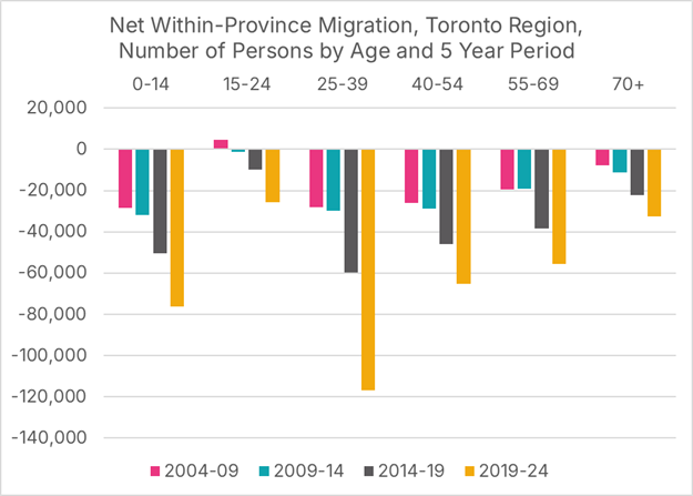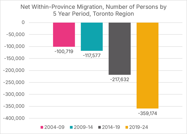 The phenomenon of families leaving the GTA and moving to other parts of the province (known as intraprovincial migration) is not new. Prior to 2014, approximately 20,000 more people, on net, moved out of the Toronto Region to other parts of the province than moved in the other direction. This rate nearly doubled between 2009-14 and 2014-19, with the Region losing 117,577 persons, on net, to other parts of the province in 2009-14, and 217,632 persons in 2014-19. It would nearly double again between 2014-19 and 2019-24, with the Region losing, on net, 359,174 persons to the rest of the province, or more than 70,000 per year.