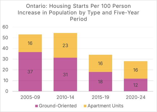 While apartment unit starts have increased in Ontario in response to population growth and decades of underbuilding, ground-oriented housing starts have fallen over time.