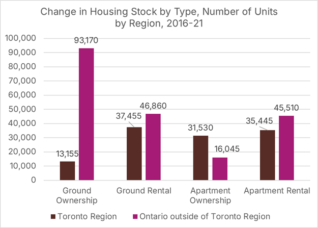 New homes were also not distributed equally across the province. The areas outside of Toronto experienced a seven-times increase in ground-oriented ownership homes compared to the Toronto Region, along with larger increases in ground-oriented rental homes and rental apartments. On the other hand, the Toronto Region’s overall increase in apartments owned by their occupants was twice as high as in the rest of the province.