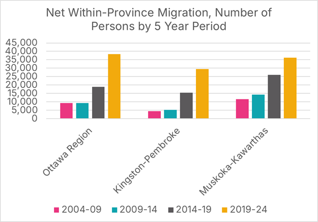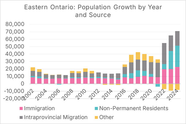 Since 2015, Eastern Ontario has experienced accelerated population growth, driven by increased permanent-resident immigration (pink), a rise in non-permanent residents (teal), and significant increases in the number of families relocating from other parts of the province (grey).