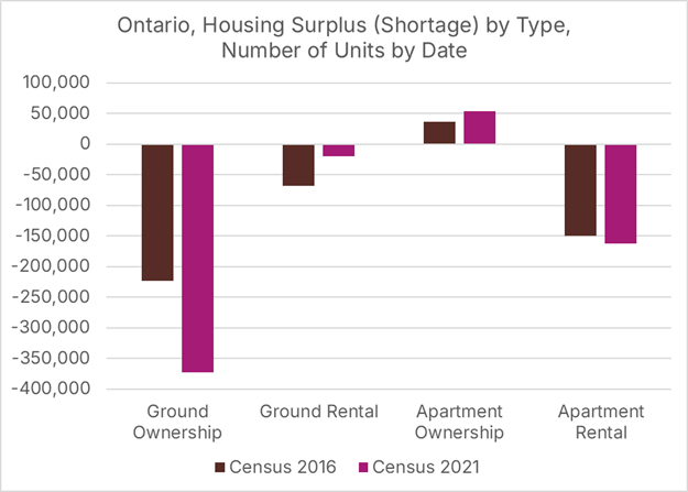 Figure 4. Ontario housing surplus (+)/shortage (-) by number of units and type, RoCA 3.0 benchmark method, Census 2016 and 2021 data