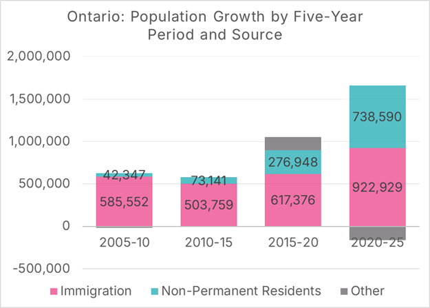 Prior to 2015, Ontario’s population had been growing by approximately 120,000 persons per year, or 600,000 persons every five years. The province experienced accelerated population growth after 2015, increasing by over one million persons in the pre-pandemic period from 2015 to 2020, and by an additional 1.5 million persons from 2020 to 2025.