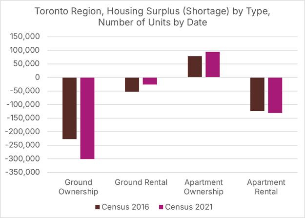 Figure 5. Toronto Region housing surplus (+)/shortage (-) by number of units and type, RoCA 3.0 benchmark method, Census 2016 and 2021 data
