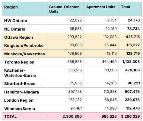 Doing so yields the following housing needs estimates by Economic Region, which incorporates pre-existing shortages, projected demographic change and population growth, and accelerated “drive until you qualify” migration out of the Toronto Region.
