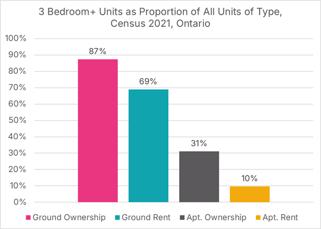 As with migration patterns, there are numerous reasons why couples with children overwhelmingly choose to live in ground-oriented housing that they own; future research will examine this question. One obvious reason is that families with children typically want homes with three or more bedrooms, and very few apartment units in Ontario meet this standard.