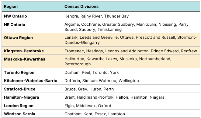 The Eastern Ontario regions on the map are Ottawa Region (#3), Kingston-Pembroke (#4) and Muskoka-Kawarthas (#5). Statistics Canada divides Halton between the Toronto Region and Hamilton-Niagara. Due to data limitations, we assign Halton exclusively to Hamilton-Niagara.