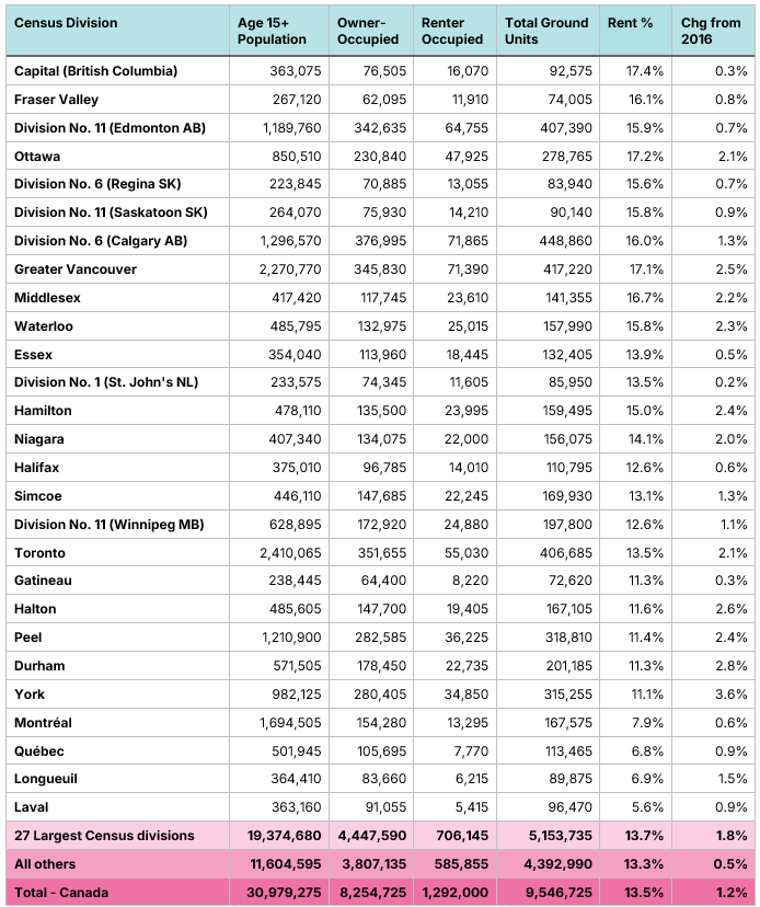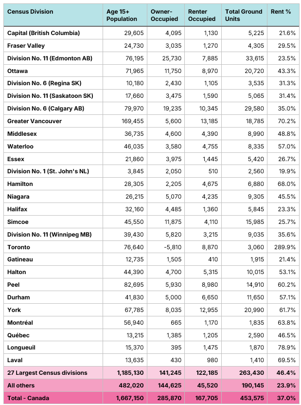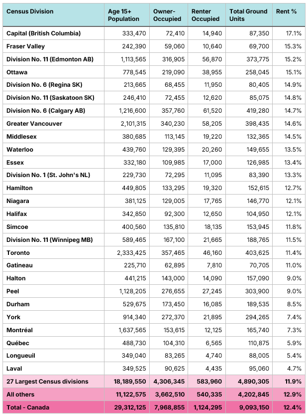 Given the high level of reader interest, a further examination of this shift from ownership to rental is warranted. To start, let’s expand our examination beyond Ontario and examine Canada’s 27 largest Census Divisions, which account for nearly two-thirds of Canada’s population.