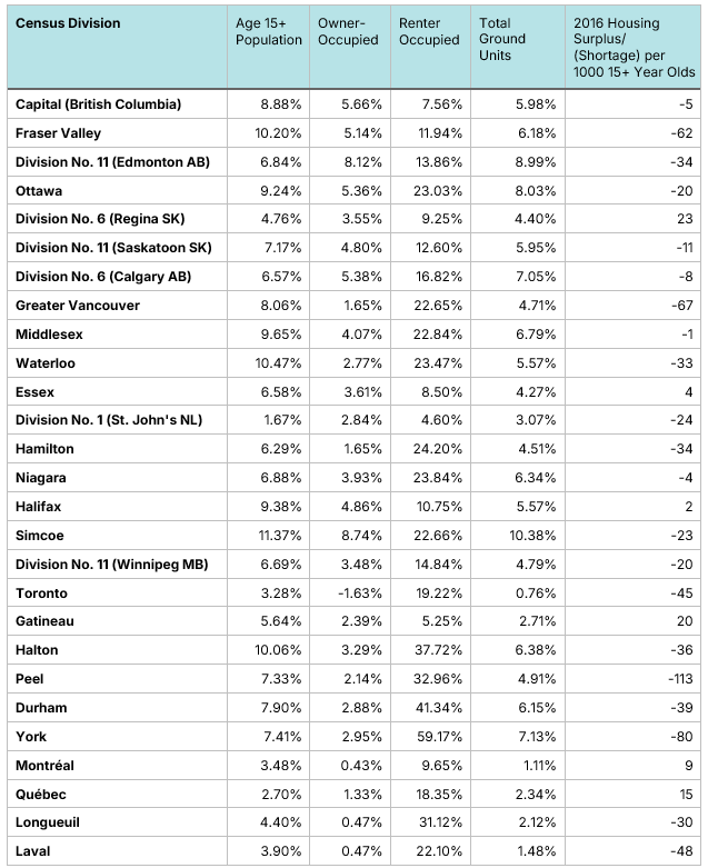 Figure 5 lists the percentage growth rates of the Age 15+ population and the stock of ground-oriented housing between 2016 and 2021, along with the estimated total housing surplus or shortage, using the RoCA Benchmark 3.0 method, for each Census Division per 1000 residents aged 15+, as of 2016; refer to RoCA Benchmark 3.0 Model: A method to forecast local housing needs for methodological details.