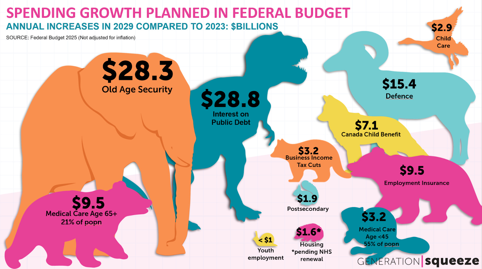 Now, when it comes to where additional dollars are going, our friends at Generation Squeeze have this fantastic infographic. It shows how much spending has gone up in certain categories. This great graph it’s got little pictures of animals on it that are proportional to the size of the changes. And big changes are the interest on public debt because both debts are going up, and interest rates are going up. That’s about $29 billion in additional spending in 2029 versus 2023.