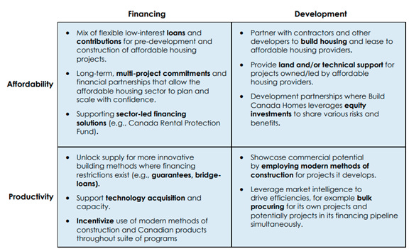 Earlier this month, the federal government issued its Build Canada Homes - Market Sounding Guide, outlining its flagship program to substantially increase affordable housing construction and accelerate housing innovation. Build Canada Homes (BCH) is one leg of the federal government’s three-legged stool to address the housing crisis, along with the reintroduction of the MURB (Multiple Unit Residential Building) tax provision and a promise to cut development charges in half for apartment construction.