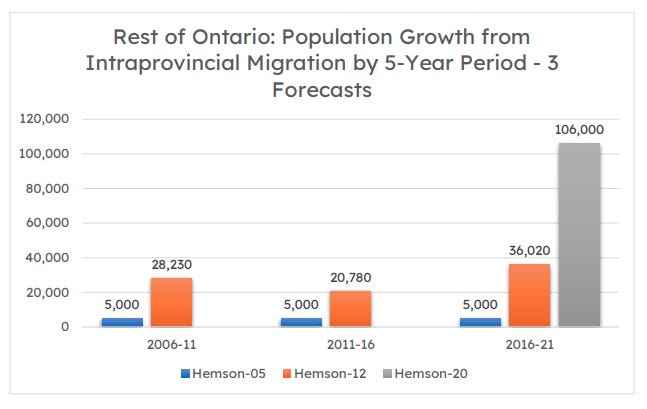 This finding should not come as a surprise, as the January 2022 report Forecast for Failure showed that for the past 20 years, provincial population projections have consistently underforecast the number of families that leave the GTA for other parts of Ontario.