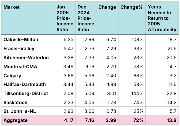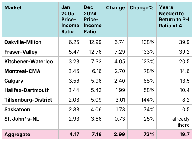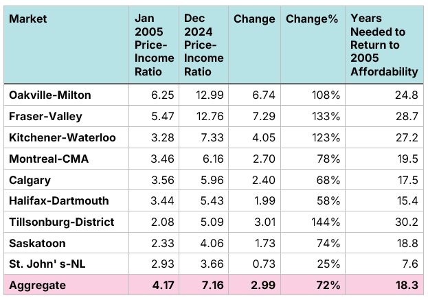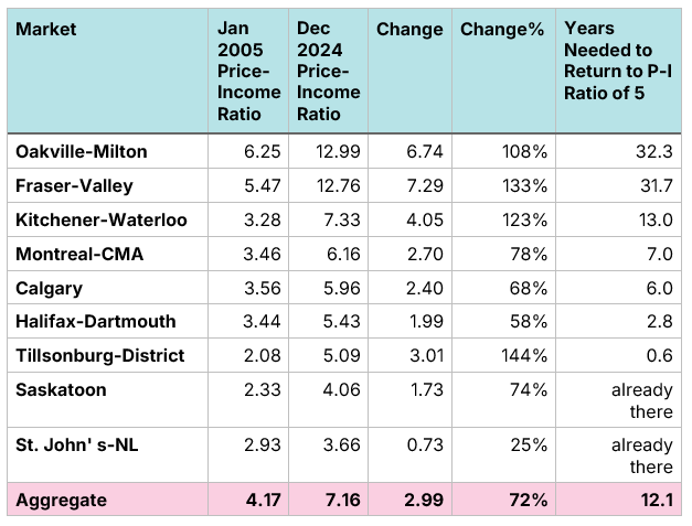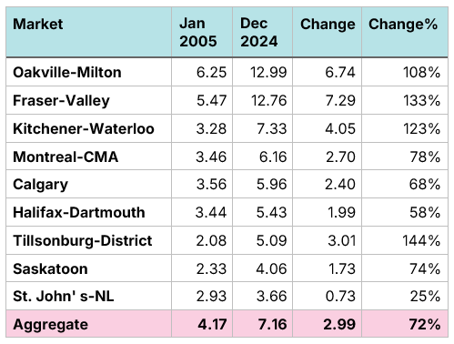 Note that in 2005, seven of nine markets on our chart had a price-income ratio under four. Today, this is unthinkable in most markets in Ontario and British Columbia.