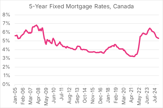Second, we will assume that five-year mortgage rates will not substantially change. Currently, rates are at the same level as 20 years ago. For this exercise, we’ll assume they stay at this level in the future, as our hypothetical relies solely on nominal wage growth to drive affordability changes.