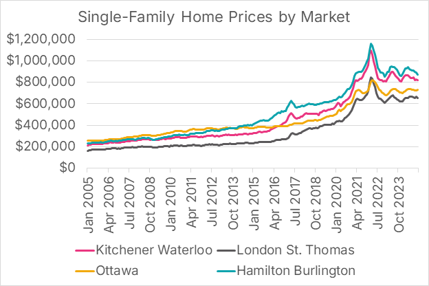 These increases in price-income ratios over time were not evenly distributed, with some markets increasing more than others. To keep this piece manageable, we will focus on nine markets: Calgary, Fraser Valley, Halifax-Dartmouth, Kitchener-Waterloo, Montreal, Oakville-Milton, Saskatoon, St. John’s, and Tillsonburg. We will also include CREA’s aggregate Canada-wide measure. At the end of this piece, we will include data on all the markets tracked by CREA’s MLS HPI tool. For this piece, we’re examining single-family home prices, though as shown in the article Southern Ontario’s Home Affordability Crisis Remains at Near-Record Levels, for any given market, home prices have grown by the same roughly proportion, regardless of the type of home.