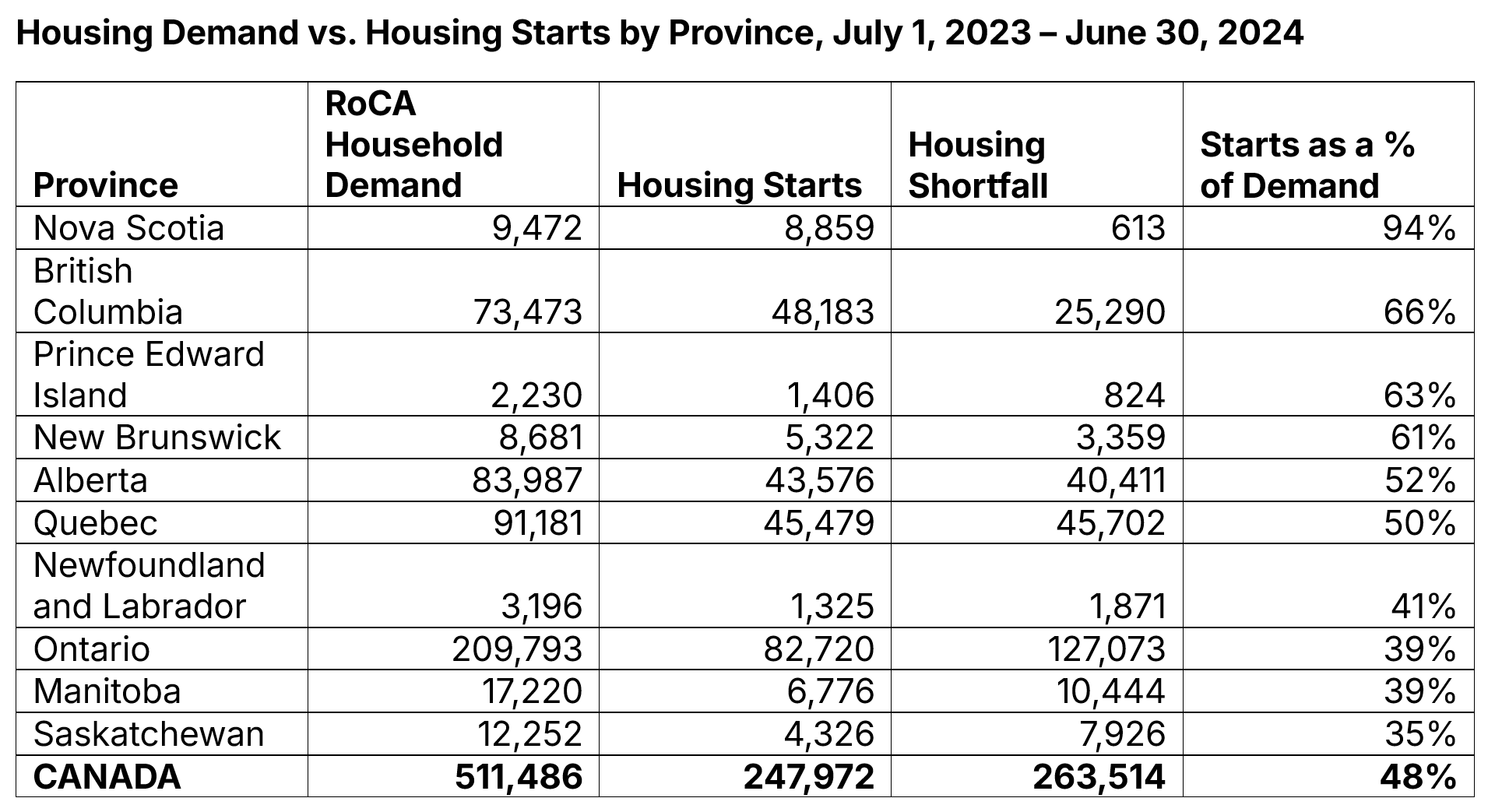 The RoCA Benchmark also allows us to determine how many houses a place would have needed to add to keep up with population growth. According to Statistics Canada’s population estimates by age and gender, Canada’s population grew by over 1.2 million people between July 1, 2023, and July 1, 2024, with Ontario adding nearly 500,000 people. Plugging this data into the RoCA formula, Canada would have needed to add over 500,000 homes, with 200,000 of those homes in Ontario.