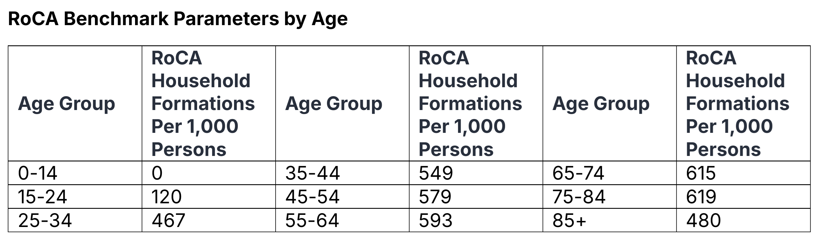 To calculate the number of homes a place should have, you sort their population by age into nine buckets, then multiply by the given factor. For example, for every 1,000 persons between the ages of 25 and 34 added to a population, the RoCA Benchmark number of households increases by 467. On the other hand, kids under the age of 16 have a factor of zero in the benchmark, as adding a child to a family typically does not increase the number of homes a place needs (though it may leave that family wanting a larger home).
