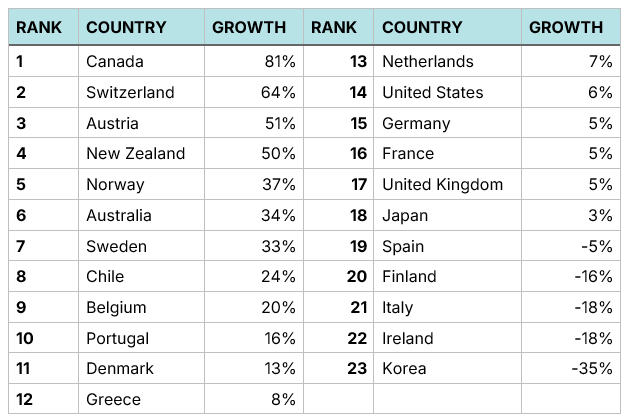 Given that our sample only includes 13 countries, it is worthwhile to examine what happens if we expand our data set beyond those with complete data from 1979 to 2024. Loosening the requirements adds 10 additional countries to the mix, but with no meaningful change in results. Canada remains #1 in terms of decreased affordability, and Switzerland remains #2.