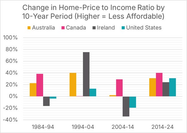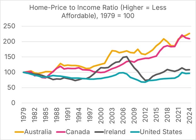 Recall, however, that Canada was only second for decreased affordability from 1979 to 2024, well behind Australia, despite Canada being much farther ahead from 2004 to 2024. Figure 7, which presents a time series of affordability changes from 1979 to 2024 for Australia, Canada, Ireland, and the United States, indicates that Australia experienced a significant price increase in the early 2000s, substantially larger than the one experienced by Canada. As well, Canada’s 1990 home price crash and subsequent price stagnation was more pronounced than the one experienced in Australia.