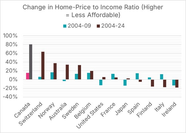 Canada leads the OECD in housing affordability deterioration since 2004: Across 23 countries with available OECD data, Canada experienced the sharpest rise in the home-price-to-income ratio, up more than 80% over the past two decades.