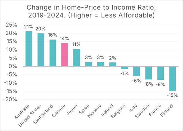 The housing crisis isn’t the same everywhere; it has a distinctly maple-flavoured character: OECD data shows that five countries in our 13-country sample have improved their affordability since 2019, underscoring that Canada’s experience stems from policy choices, not a global inevitability.