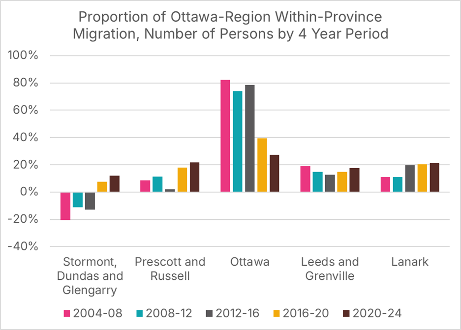 Outside of a large, one-time jump in 2016-20, the four Ottawa region census divisions outside of the City of Ottawa have experienced large increases in net intraprovincial in-migration, while the City of Ottawa’s levels have remained relatively stable.\