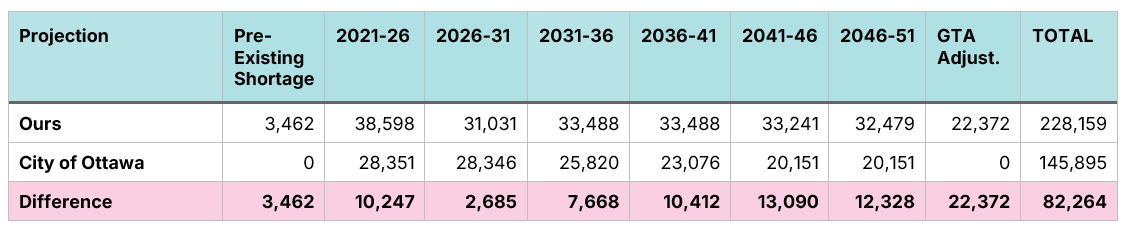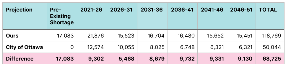 Note: The City of Ottawa’s growth projections only extend to 2046, and show steadily declining needs from 2021 to 2046. To ensure a fair comparison between the two systems, we take the City’s 2041-46 apartment need projection and replicate it for 2046-51. This is almost certainly an overestimate of what the City would have projected, given that they show need continually falling, rather than staying steady.