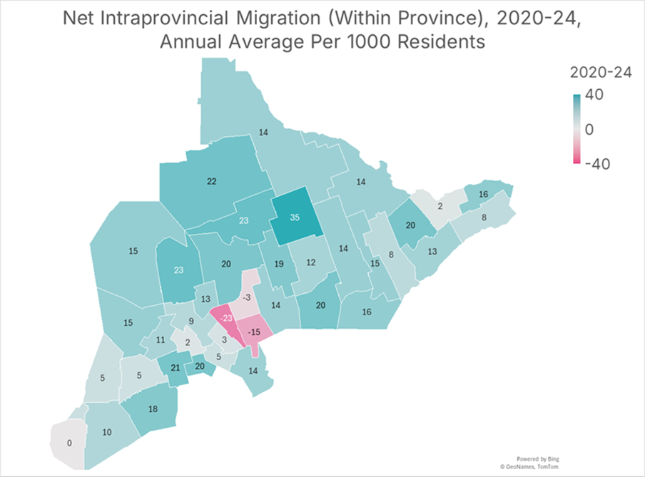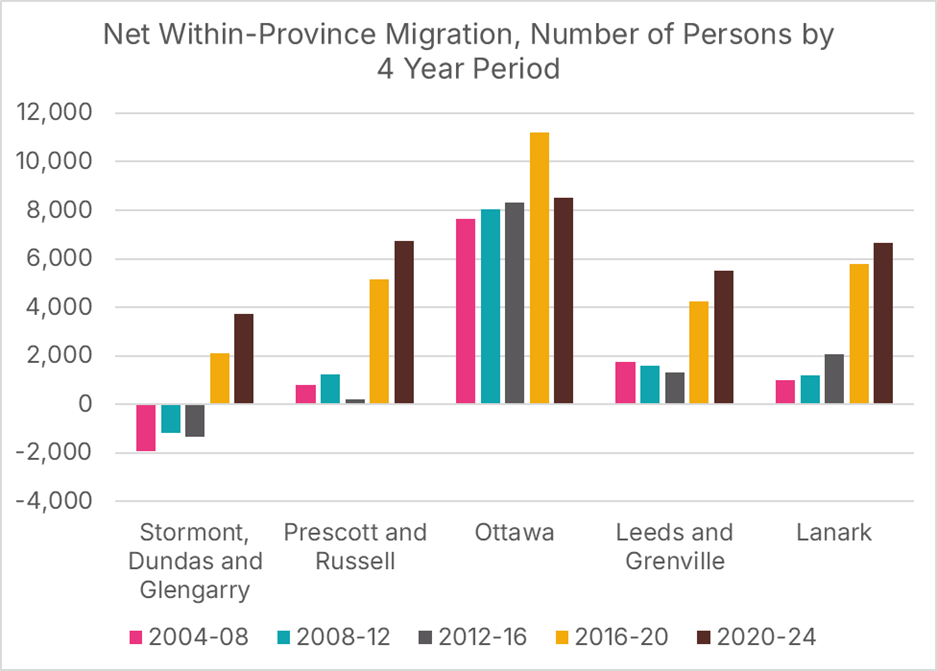 Relative to the size of the existing population, the communities surrounding the City of Ottawa are experiencing a significantly higher rate of families relocating from other parts of Ontario. Between 2020 and 2024, the City of Ottawa added 2 persons from intraprovincial migration, on net, per 1000 residents each year. In contrast, Lanark Census division added 20, one of the highest rates in the province.