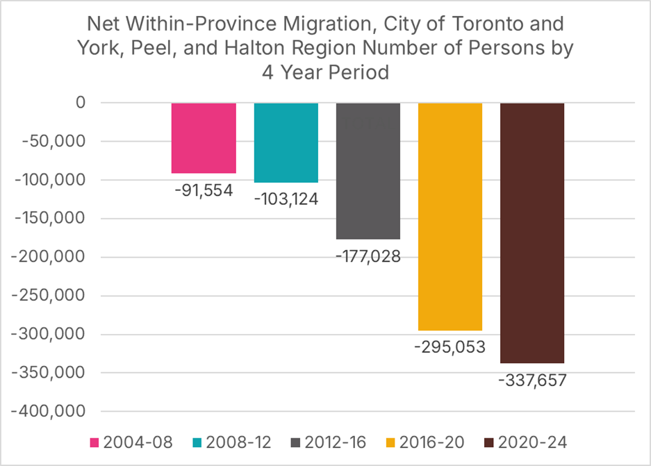 While year-to-year variation in migration numbers is evident, there is an unmistakable trend toward more individuals and families leaving the GTA for other parts of Ontario.
