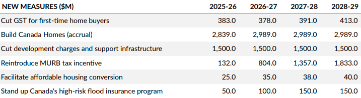 GST cut for first-time homebuyers: This measure was included in Bill C-4, known as the Making Life More Affordable for Canadians Act. The Bill was introduced into the House in July and has still not passed, but when it does, first-time homebuyers who purchased a home on or after May 27, 2025, will receive some or all of the federal HST they paid on that home rebated, so long as the home price was under $1.5 million. The province of Ontario recently announced that it would match the rebate on the provincial portion of the rebate. Several groups have called on the federal government to expand the rebate to all primary-residence purchasers of new homes, with Premier Ford indicating that the province of Ontario would also match such a move. However, it appears highly unlikely that the federal government will introduce such a provision in today’s budget.