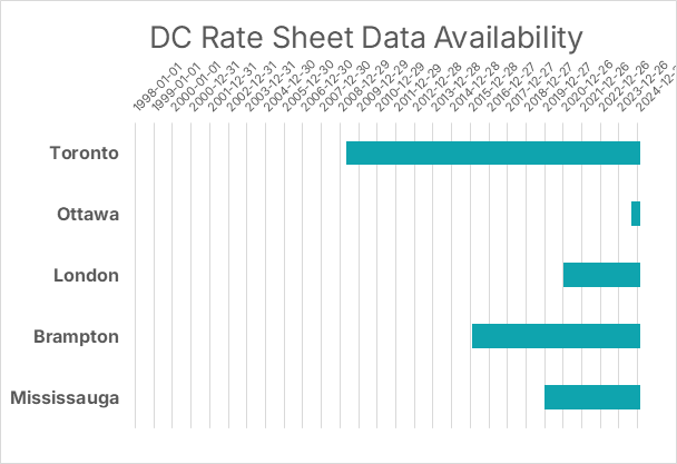 To put into context how little historical development charge governments make available, we examined the availability of rate sheet data on the main DC website landing pages for Toronto, Ottawa, London, Brampton, and Mississauga, going back to 1998, the first full year the modern Development Charges Act1 was in effect.