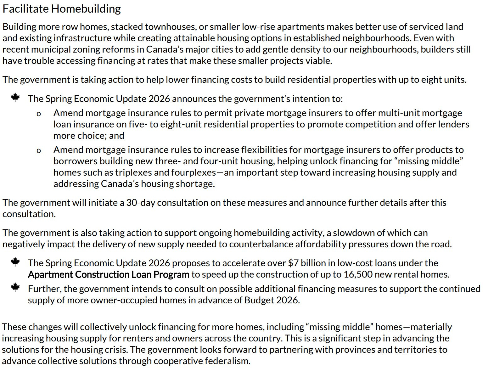 The bullet point on allowing “mortgage insurers to offer products to borrowers building new three- and four-unit housing” sounded very familiar. In fact, it sounded a lot like our recommendation to “…increase the supply of missing middle housing, create an application stream in the CMHC’s Apartment Construction Loan Program (ACLP) for smaller builders who wish to build 2-4 unit buildings or require loans less than $1 million in size.” which appeared in both our January 2026 report A Blueprint to Restore Homeownership for Young Canadians (Recommendation 3) and our April 2026 report From Cornerstone to Capstone: Building Canada’s Missing Middle Gentle-Density Housing (Recommendation 11a).