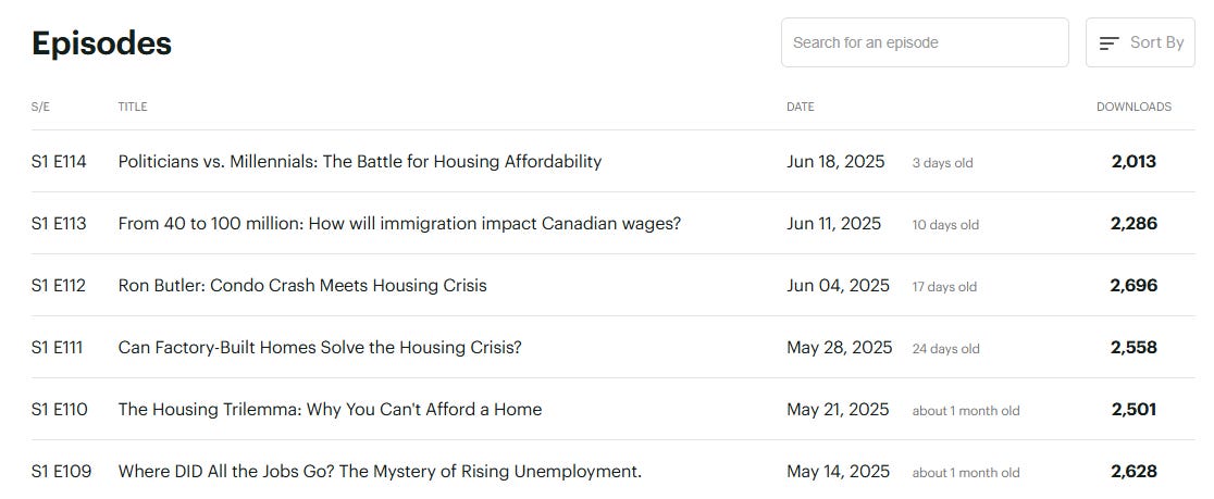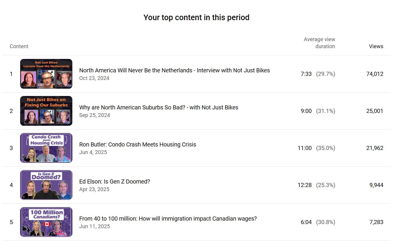 Similar to our audio version, our typical recent episodes receive around 2,500 views. We have had a few breakout hits, including guest episodes with Jason Slaughter of Not Just Bikes, Ron Butler, and Ed Elson, as well as a recent episode featuring Mike and Sabrina discussing a Bank of Canada study on the impact of immigration changes on wages.