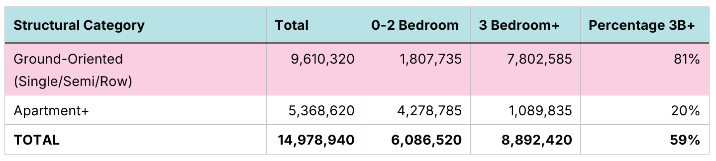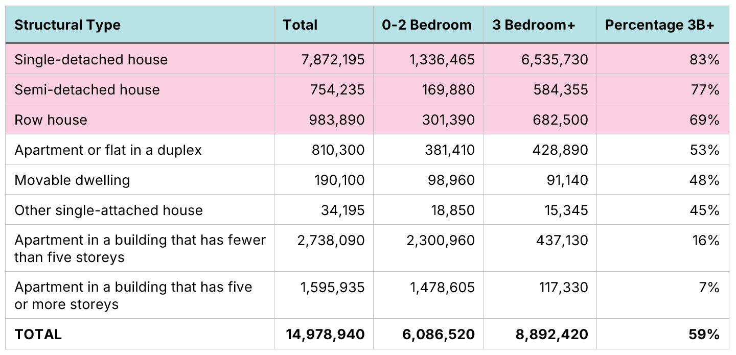 Although CMHC housing starts data does not provide bedroom breakdowns, Census data does. A Census 2021 housing data table shows that there are substantial differences in the average number of bedrooms each of these housing types has. In particular, the first three categories have a much higher proportion of 3-bedroom units suitable for families with children.