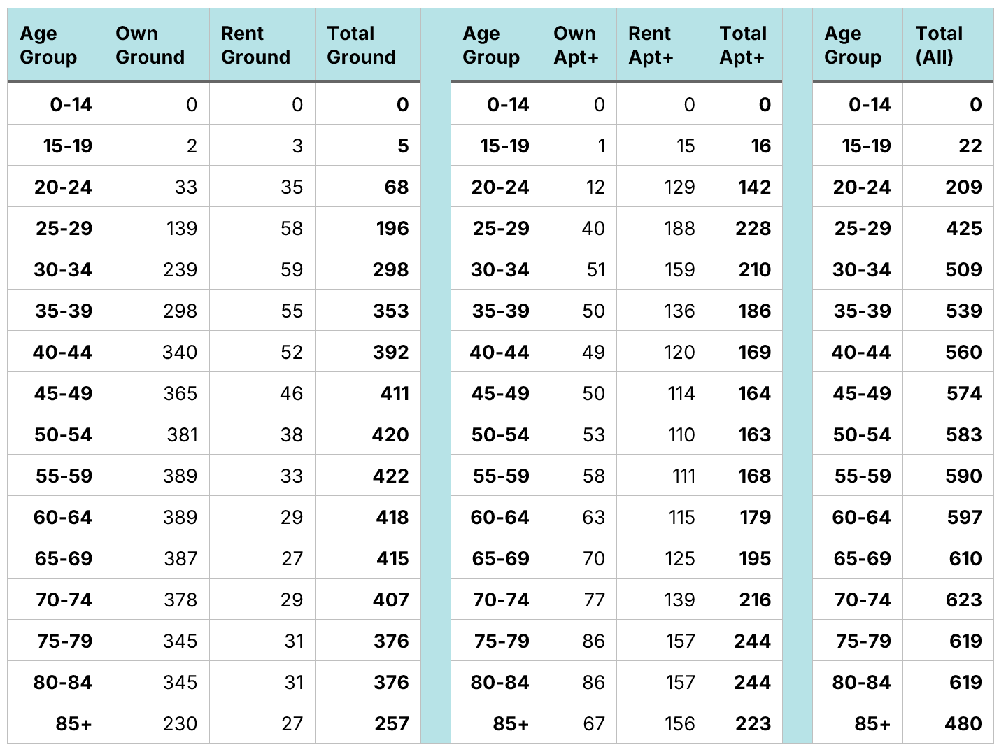 Ownership of a ground-oriented home is, by far, the most common housing type for persons over the age of 30, as apartment rentals experience a dramatic drop from age group 25-29 to 30-34, and ownership of ground-oriented housing experiences an equally dramatic rise.