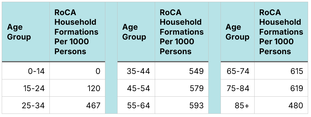 One positive unintended consequence of using that Census 2016 data table is that it breaks headship rates into 5-year age categories for persons under age 75. The previous RoCA Benchmark utilized 10-year age categories, so that this revision will allow for additional precision. This improvement is particularly important, as the housing needs for 15–19-year-olds (who largely live with a parent) are very different than those of 20–24-year-olds, and the previous RoCA Benchmark lumped them into a single category.