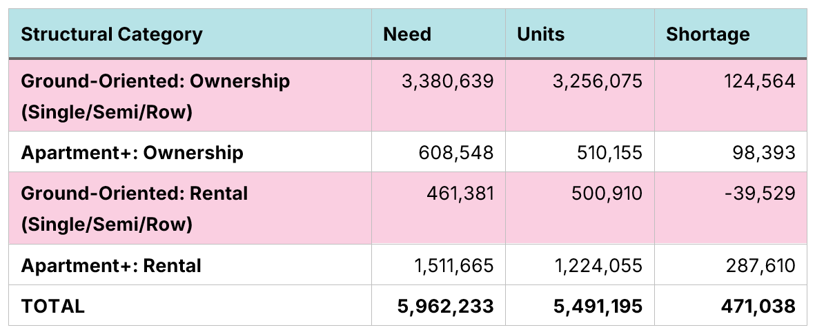 Using this new methodology, we show that as of Census 2021, Ontario had substantial shortages of rental apartments, ground-oriented ownership housing, and, surprisingly, condo apartments.
