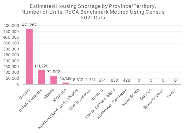 Using RoCA Benchmark 1.0, we estimated that, as of Census 2021, Ontario had a shortage of 471,267 units. Under RoCA 2.0, this estimate is now 471,038 units, with the small change coming from having more granular age categories.