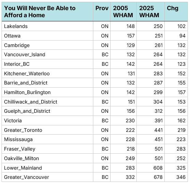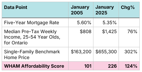 Using data from the Canadian Real Estate Association, we can generate WHAM scores for 51 different local markets between January 2005 and January 2025. We find a massive but uneven deterioration of affordability across Canada.