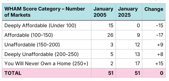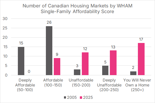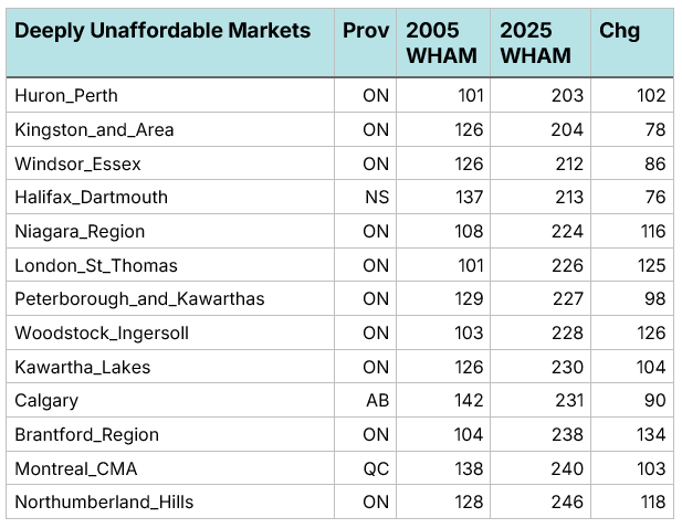 There is not a single market in Canada where housing affordability has improved in the last twenty years. However, some markets experienced faster affordability declines than others. The median Canadian market had a WHAM score of 120 (Affordable) in January 2005, which increased by 99 weeks to 219 (Deeply Unaffordable) by January 2025.