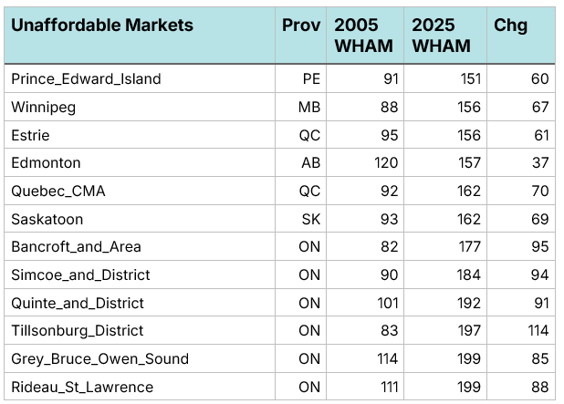 Outside of St. John’s and Moncton, these were all formerly deeply affordable communities that transitioned into the affordable category by 2025, though all nine markets had WHAM increases smaller than the median. Newfoundland, New Brunswick, and Saskatchewan were also three of the four provinces where wages grew the fastest, in percentage terms, over the past 20 years, which has helped their affordability. It is a good reminder that home prices are only one of three components of housing affordability; wages play an important role as well.