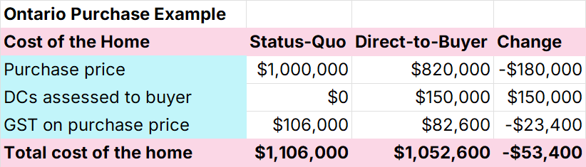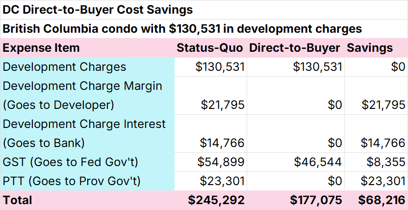 Instituting a direct-to-buyer development charge system can save homebuyers tens of thousands of dollars in reduced tax-on-tax, interest charges, and junk fees.