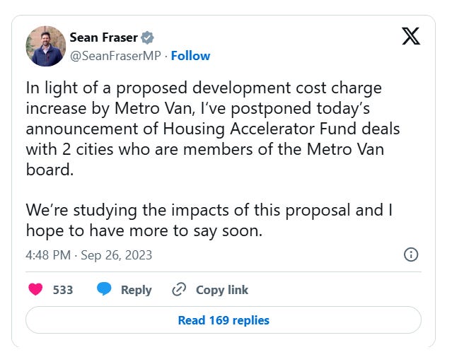 In response, then Federal Housing Minister Sean Fraser announced via tweet that he would postpone the announcement of Housing Accelerator Fund agreements with Burnaby and Surrey.