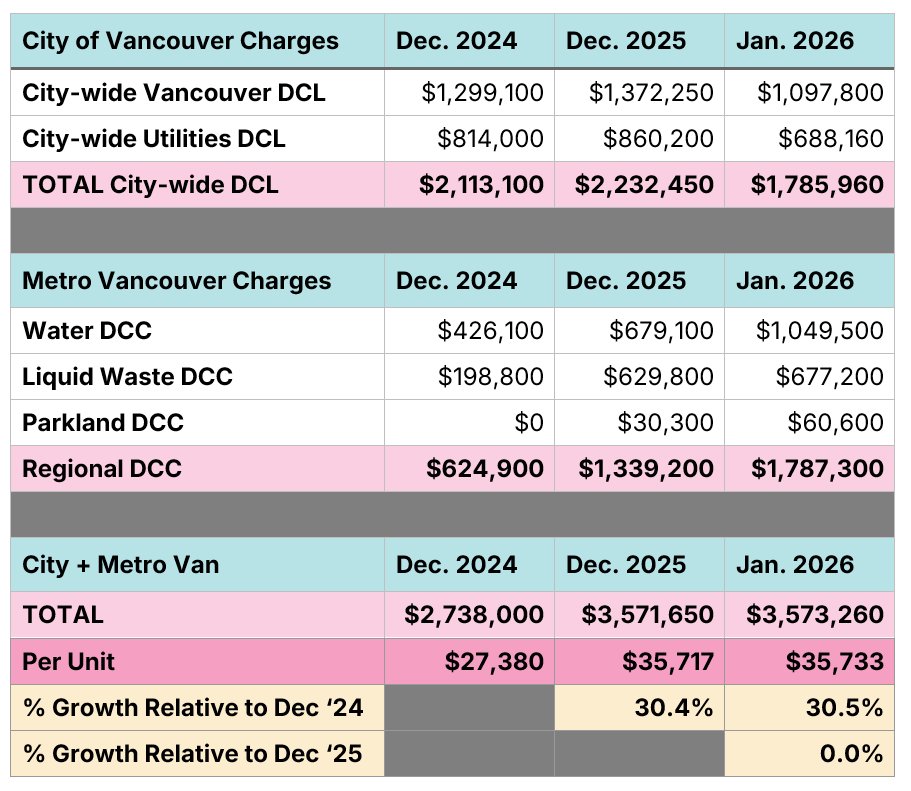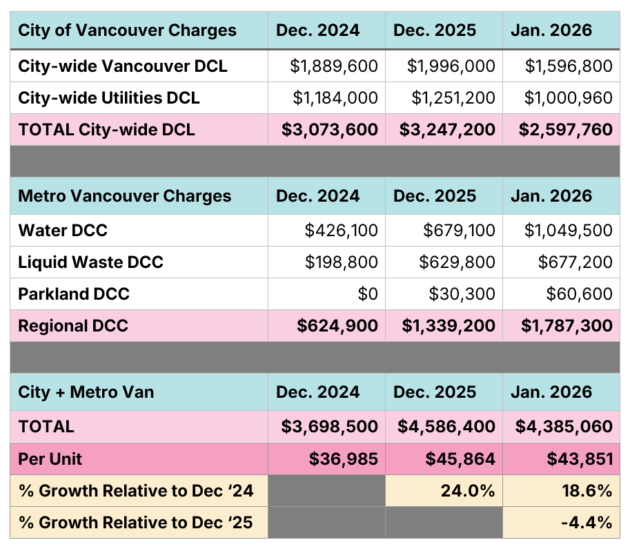 The math is brutal: For a typical 100-unit apartment building, Metro Vancouver’s DCC increase can fully offset the City of Vancouver’s DCL cut—leaving total per-unit charges unchanged.