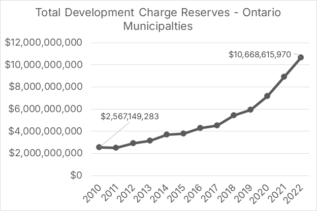 Municipalities in Ontario have collected billions of dollars in development charges, but have not spent a significant portion of it. This lack of spending was not part of the plan to allow reserves to accumulate and fund larger infrastructure projects. On average, for every dollar of forecasted spending on infrastructure, Ontario municipalities have only spent 62 cents.